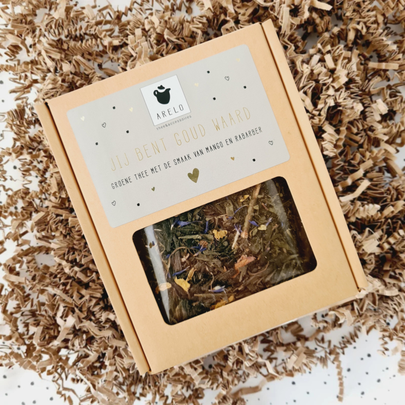 We hebben verschillende theetjes om uit te kiezen. De ‘Lieve thee’ is een heerlijke thee van milde groene thee met rozenknoppen, rozenblaadjes en natuurlijk gekleurde suikerhartjes. De thee heeft een subtiele aardbeien smaak. Een heerlijke thee vol liefde! De ‘Feestelijke thee’, is een fruitige zwarte thee met de subtiele smaak van aardbei en abrikozen. Door de gekleurde blaadjes in de thee lijkt het net of er confetti in zit. De ‘Word maar snel beter thee’, is een heerlijke thee met een mix van citroengras, gember en fruitstukjes, die bijdraagt om snel weer op krachten te komen.