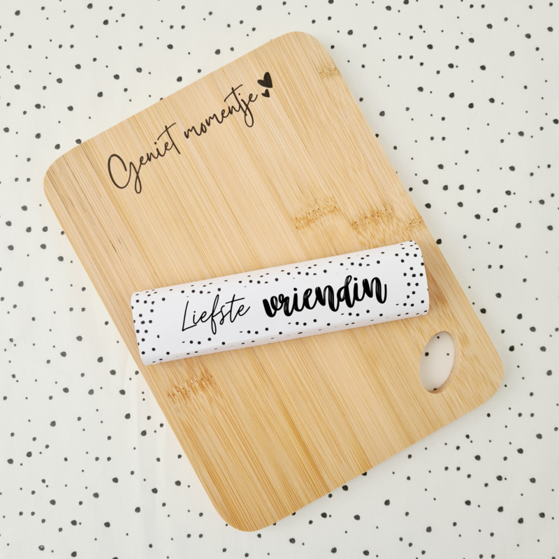 De thee & chocolade serveer je op het leuke serveerplankje met de tekst 'Geniet momentje'. Precies wat je je vriendin geeft met dit cadeau, een momentje om van te genieten.