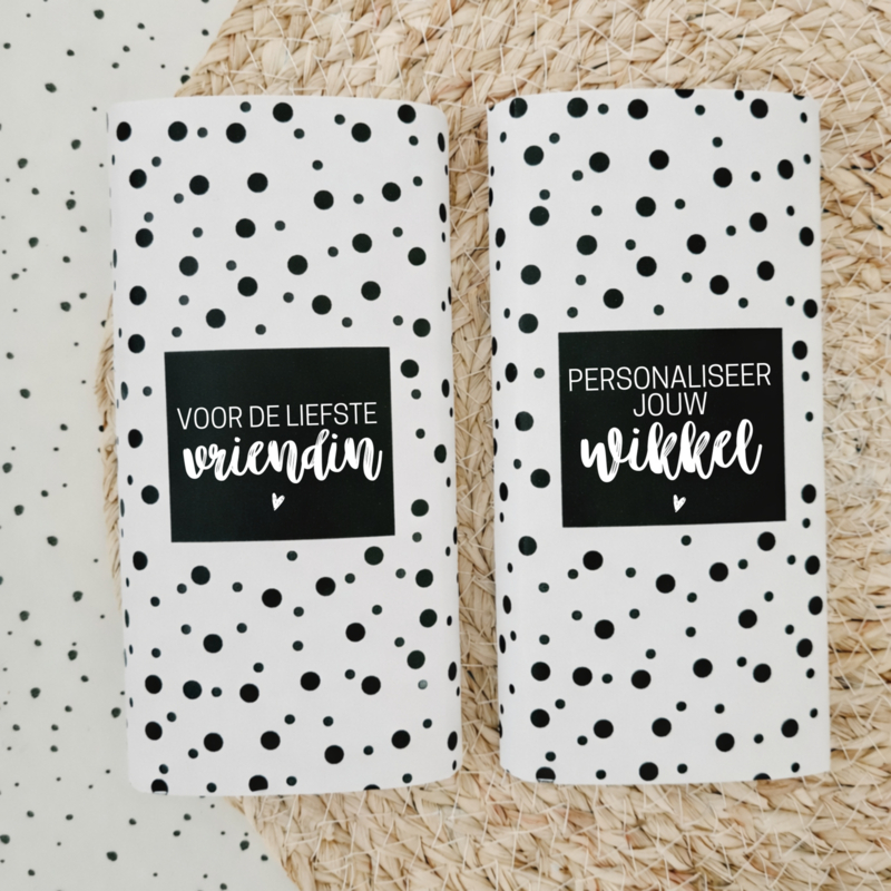 De chocoladereep zit verpakt in een hele leuke chocoladewikkel met de tekst: 'Voor de liefste vriendin!' of 'Super blij met een vriendin zoals jij!'. Wil jij het cadeautje nog persoonlijker maken? Kies er dan voor om de wikkel te personaliseren! Wij drukken dan jouw korte boodschap of de naam van je bestie op de wikkel.