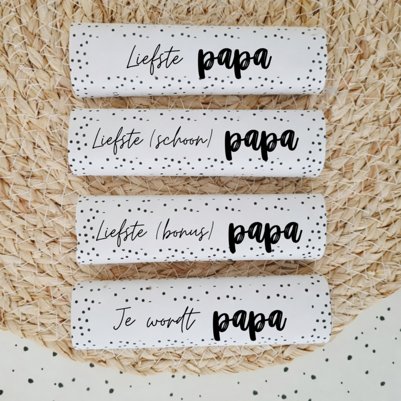De kleine chocoladereep zit verpakt in een hele leuke chocoladewikkel met tekst. Je hebt de keuze uit verschillende wikkels. Wil jij het cadeautje nog persoonlijker maken? Kies er dan voor om de wikkel te personaliseren! Wij drukken dan jouw korte boodschap of de naam van jouw papa op de wikkel.