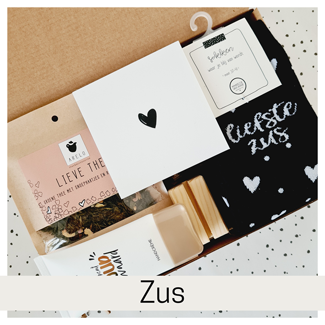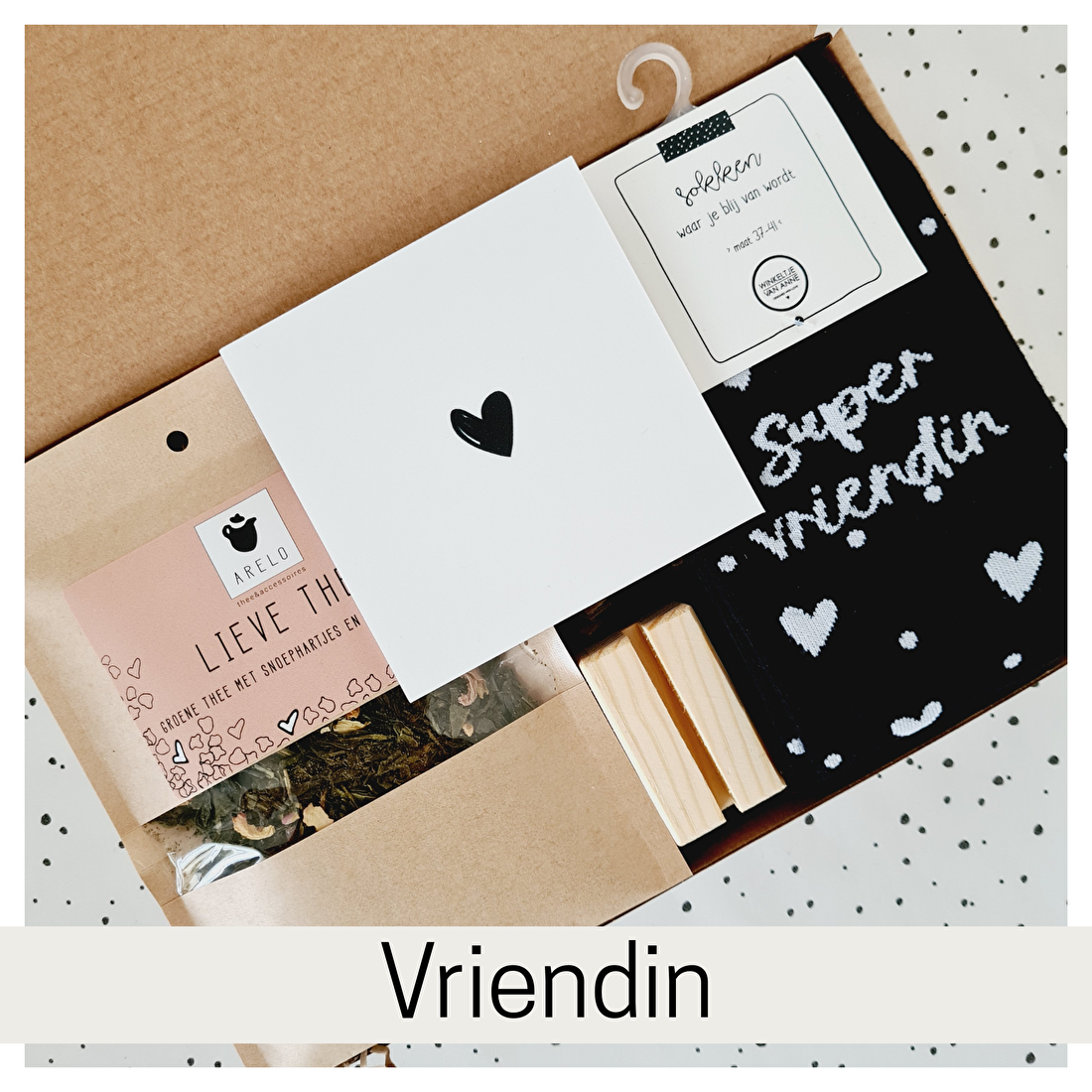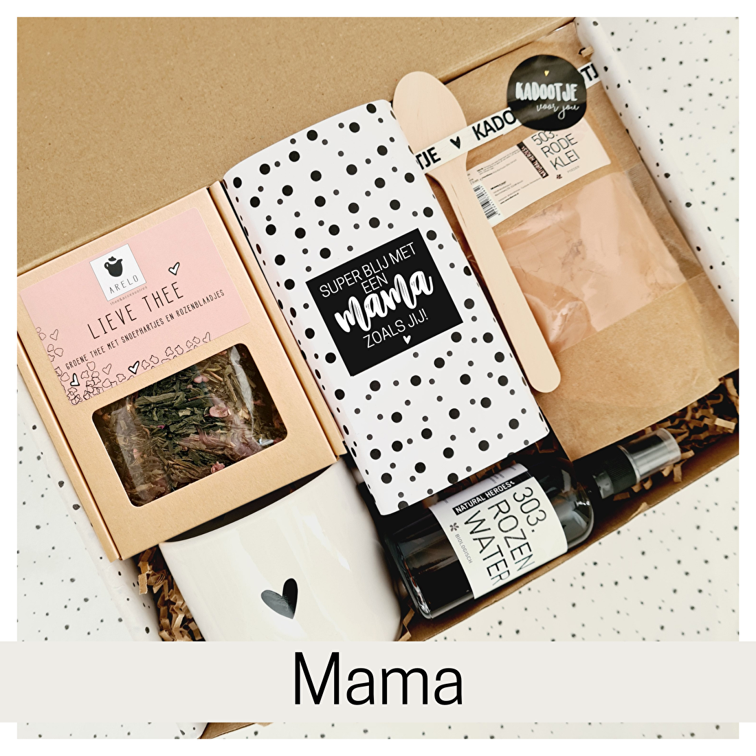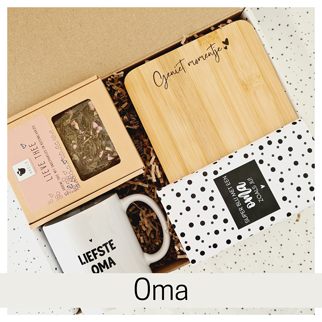 Tijdens het bestellen maak je het cadeau helemaal persoonlijk. Kies uit verschillende theesoorten, mokken, sokken en gepersonaliseerde chocoladewikkels en stel zo een pakket samen dat perfect past bij zijn of haar smaak.