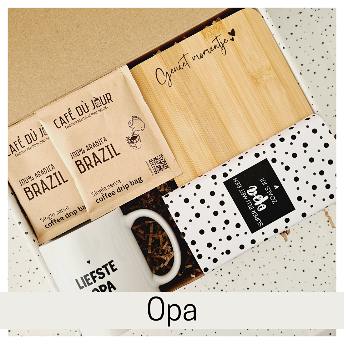 Wil je het extra speciaal maken? Voeg dan een naam of lieve boodschap toe aan één van onze vrolijke chocoladewikkels. Zo geef je niet zomaar een cadeau, maar een persoonlijk gebaar dat bijblijft.